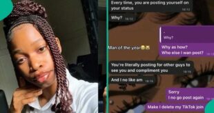 [ad_1] A Nigerian lady has shared a post on TikTok showing her recent conversation with a young man who cautioned her In the chat, the man warned her against posting her photos on social media, stating that she wanted to get the attention of men The lady’s response to his …