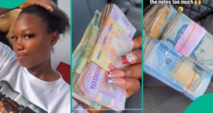 [ad_1] A Nigerian lady said she had 450,000 francs, and she decided to convert it to naira to see how much it would be She was surprised that after the conversion, she was given a lot of naira notes, such that she loaded them in a bag According to her, …