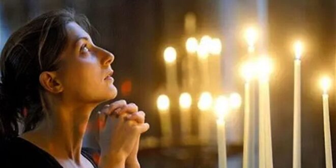 A woman kneels in church and looks up to heaven with candles in the background. (istock)