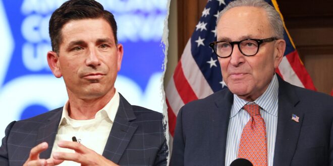 Chad Wolf, former acting secretary of the Department of Homeland Security (DHS), left, speaks during the Conservative Political Action Conference (CPAC) in Dallas, Texas, on July 9, 2021. Senate Minority Leader Chuck Schumer, D-N.Y., right, speaks to the media during a news conference in the U.S. Capitol Building on Dec. 3, 2025, in Washington, D.C. (Dylan Hollingsworth/Bloomberg via Getty Images; Anna Moneymaker/Getty Images)