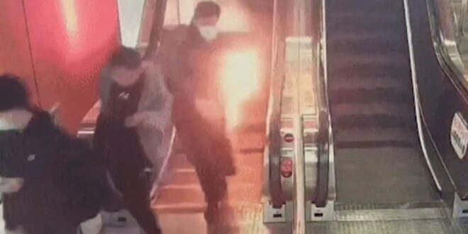 The horrifying scenes unfolded at an underground station in China when the portable charger ignited inside a commuter’s jacket pocket as he made his way down an escalator.