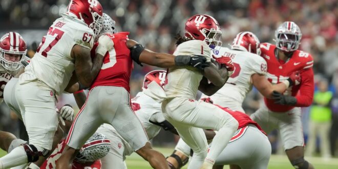 Indiana Hoosiers linebacker Rolijah Hardy (21) attempts to stop Ohio State Buckeyes running back Bo Jackson (25) on Saturday, Dec. 6, 2025, during the Big Ten football championship at Lucas Oil Stadium in Indianapolis. (Grace Smith/IndyStar / USA TODAY NETWORK via Imagn Images)