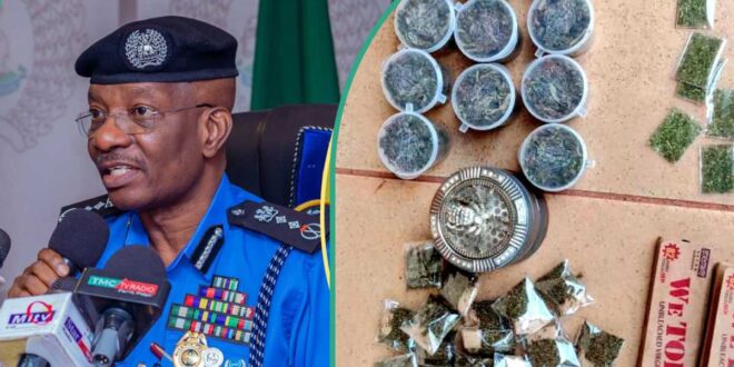Exhibits including Canadian Loud, Colorado, and a weed crusher recovered from the suspect’s hideout. Photo: X/EnuguPoliceCommand