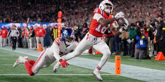 New England Patriots wide receiver Kyle Williams (18) catches a touchdown pass against New York Giants cornerback Paulson Adebo (21) during the first half of an NFL football game Monday, Dec. 1, 2025, in Foxborough, Massachusetts. (AP Photo/Charles Krupa)