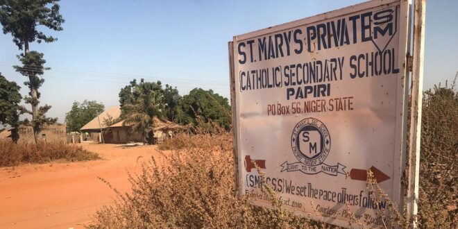 A signboard for St Mary’s Private Catholic Secondary School stands at the entrance of the school in Papiri, Agwarra local government, Niger state, on November 23, 2025. (Ifeanyi Immanuel Bakwenye / AFP via Getty Images)