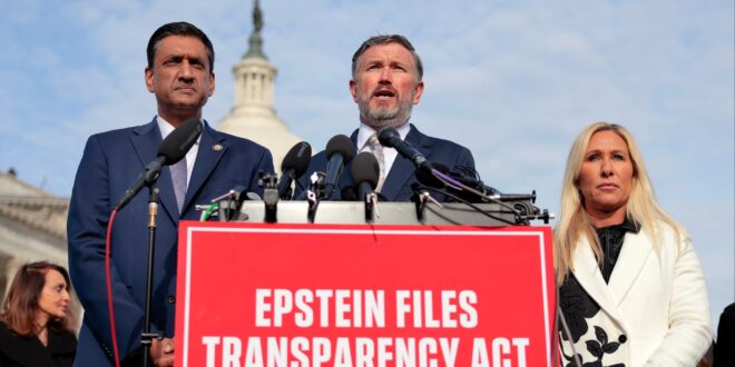 Thomas Massie (C) speaks alongside Ro Khanna (L) and Marjorie Taylor Greene (R) during a news conference on the Epstein Files Transparency Act outside the US CapitolCredit: Getty