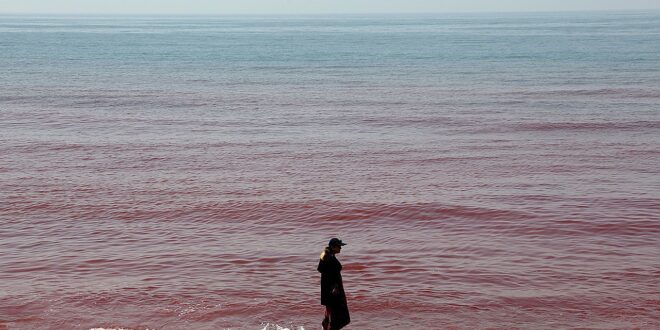 The rainwater is said to have mixed with mineral-rich sediment and seawater, creating a vivid, blood-red scene.