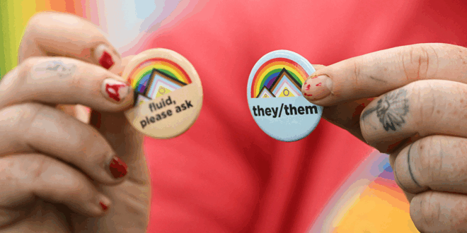 Person holds pins about gender pronouns. ((Photo by PATRICK T. FALLON/AFP via Getty Images))