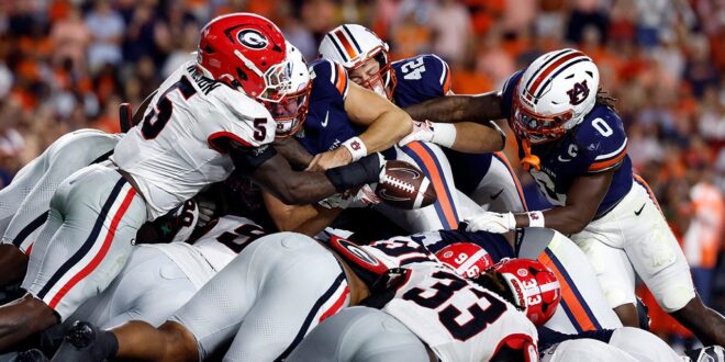 Georgia linebacker Raylen Wilson (5) knocks the ball out of the hands of Auburn quarterback Jackson Arnold (11) as he dives for the end zone during the first half of an NCAA college football game, Saturday, Oct. 11, 2025, in Auburn, Alabama. (AP Photo/Butch Dill)